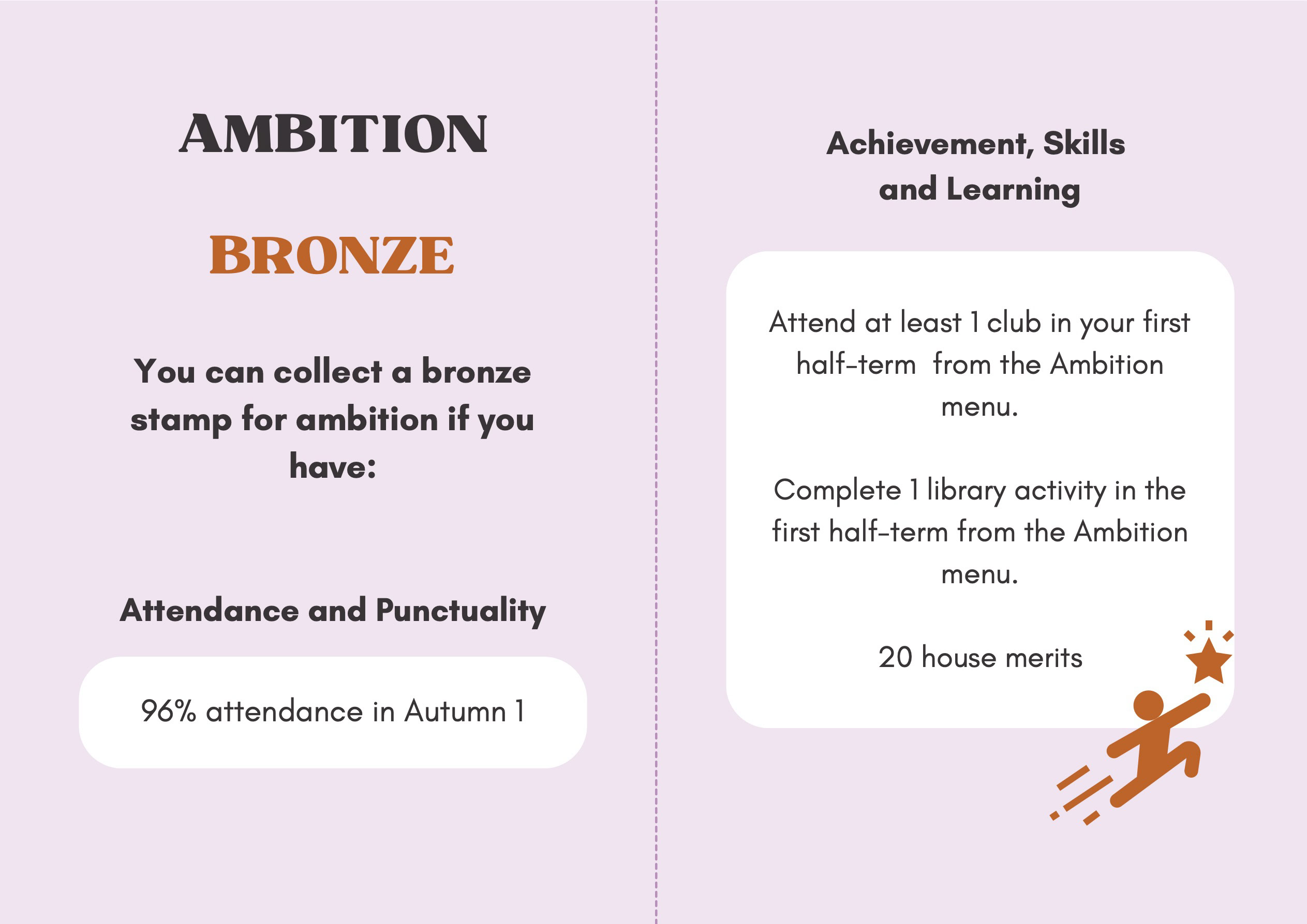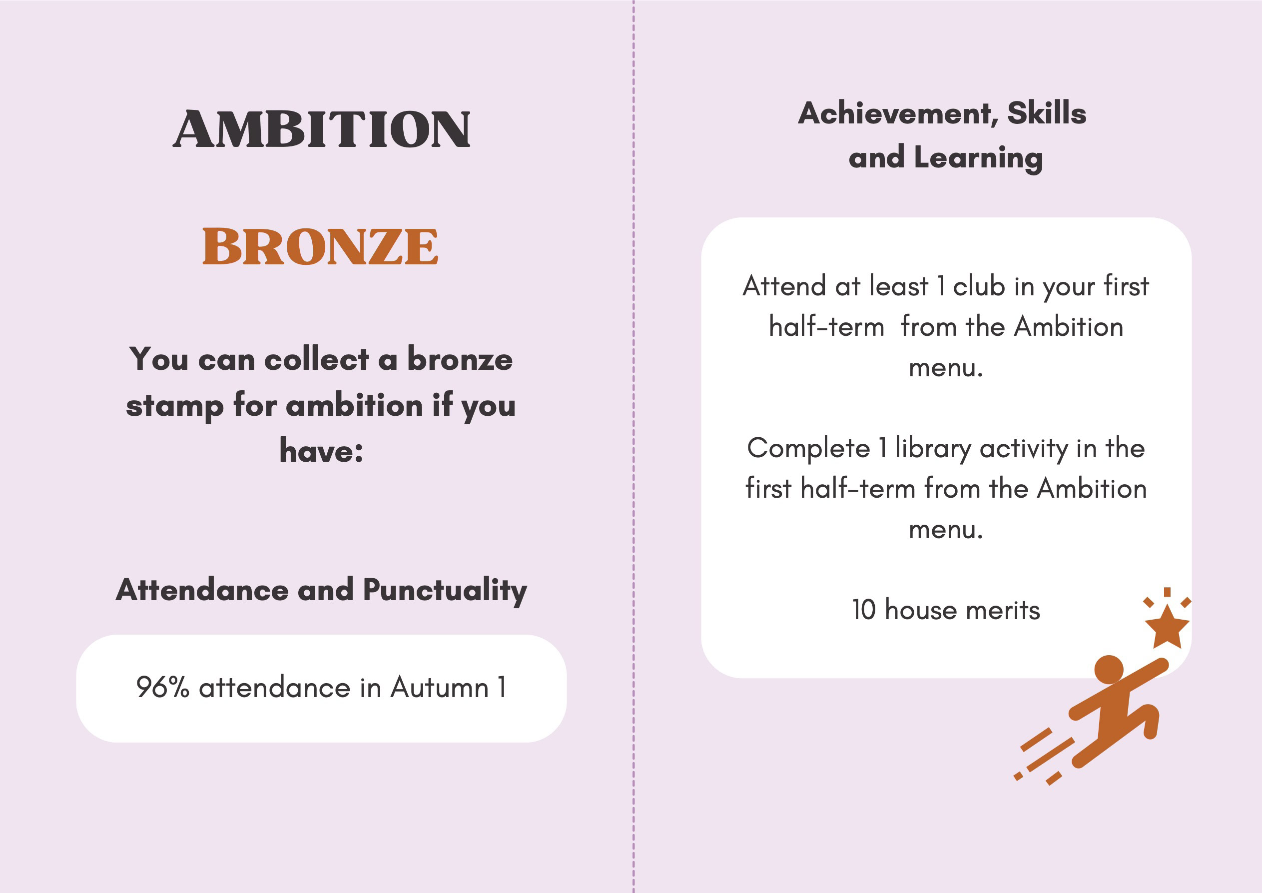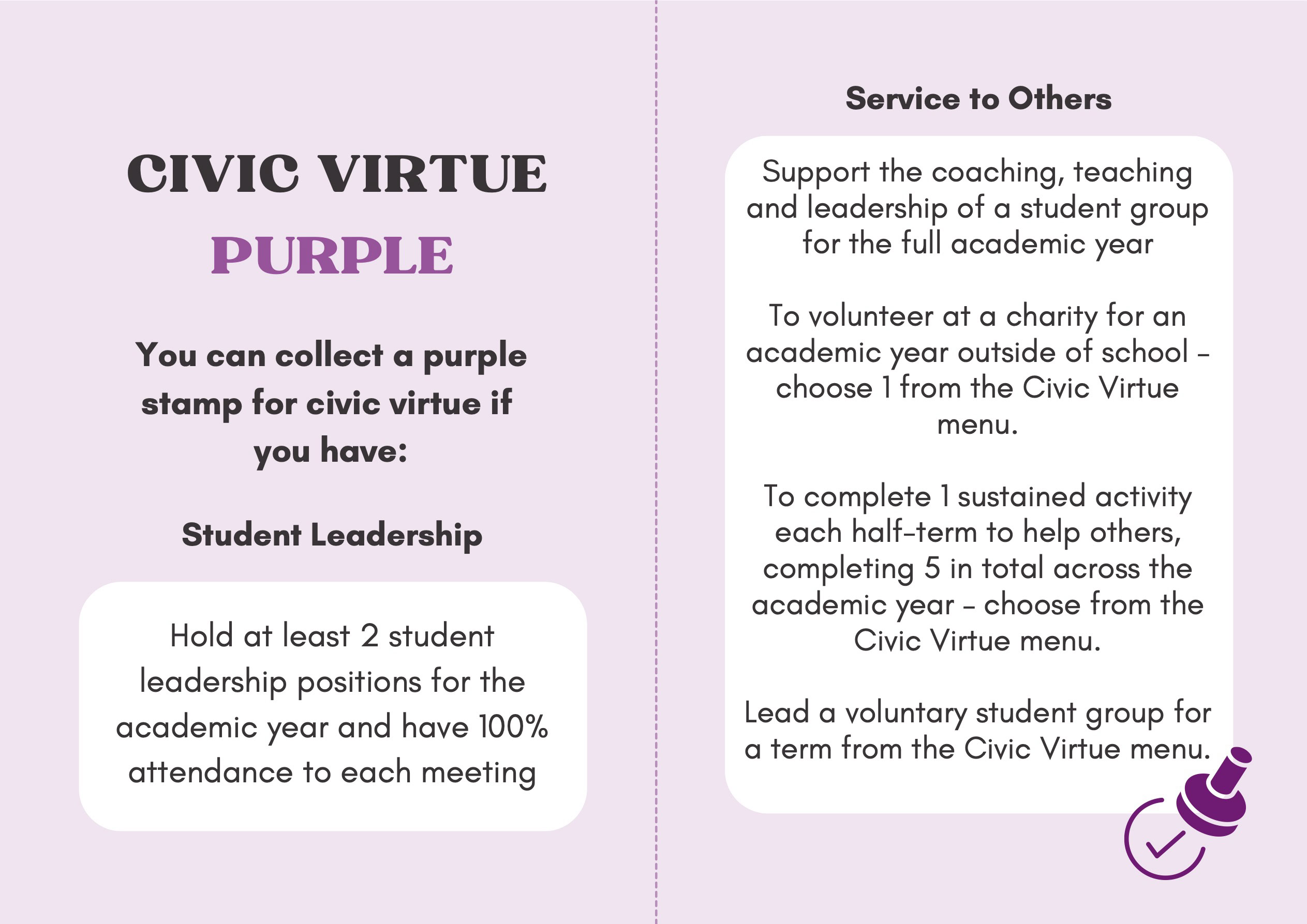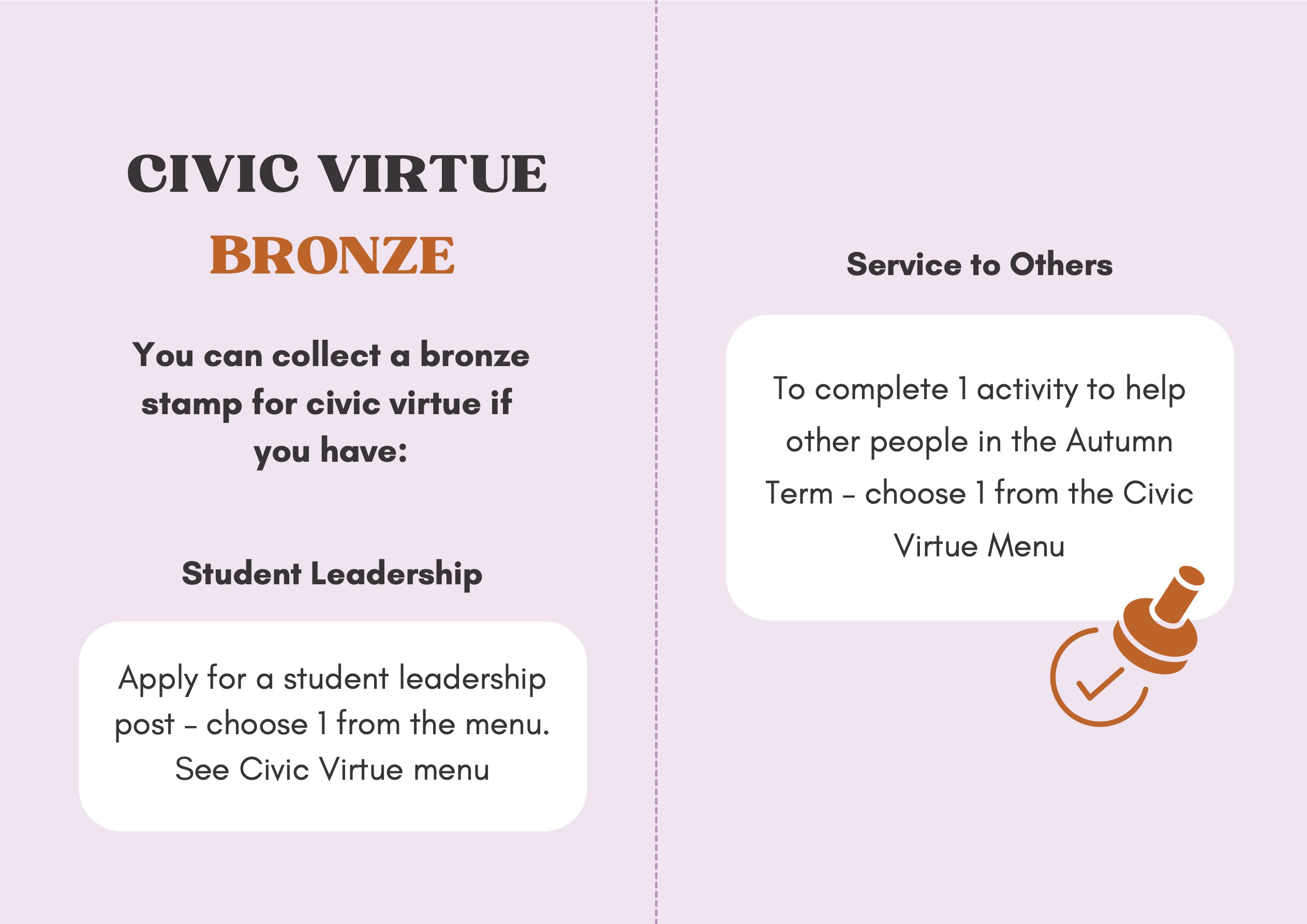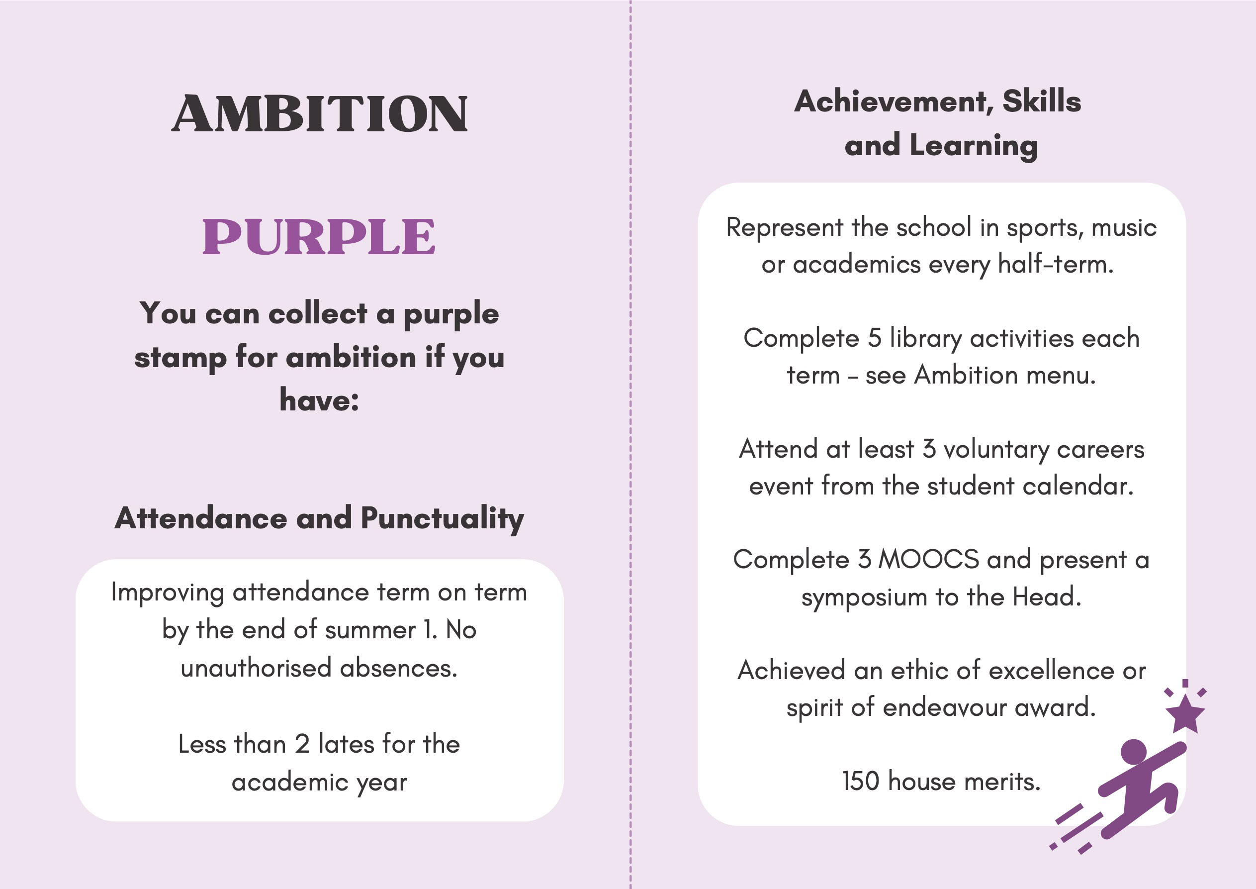 To recognise and celebrate student achievements, the Personal Development Passport is linked to our award system. Students can earn awards at four levels - Bronze, Silver, Gold, and Purple - across three core values: Ambition, Character, and Civic Virtue. Awards are presented at termly celebrations, acknowledging students’ dedication and fostering a culture of active participation.