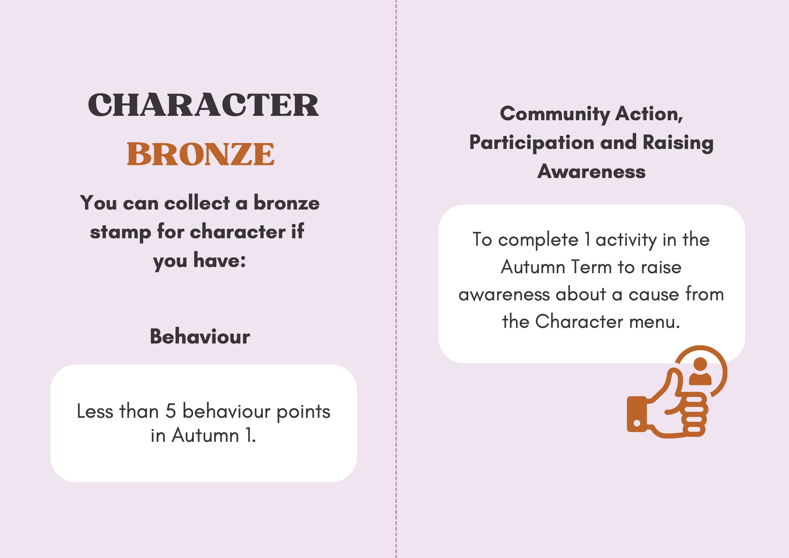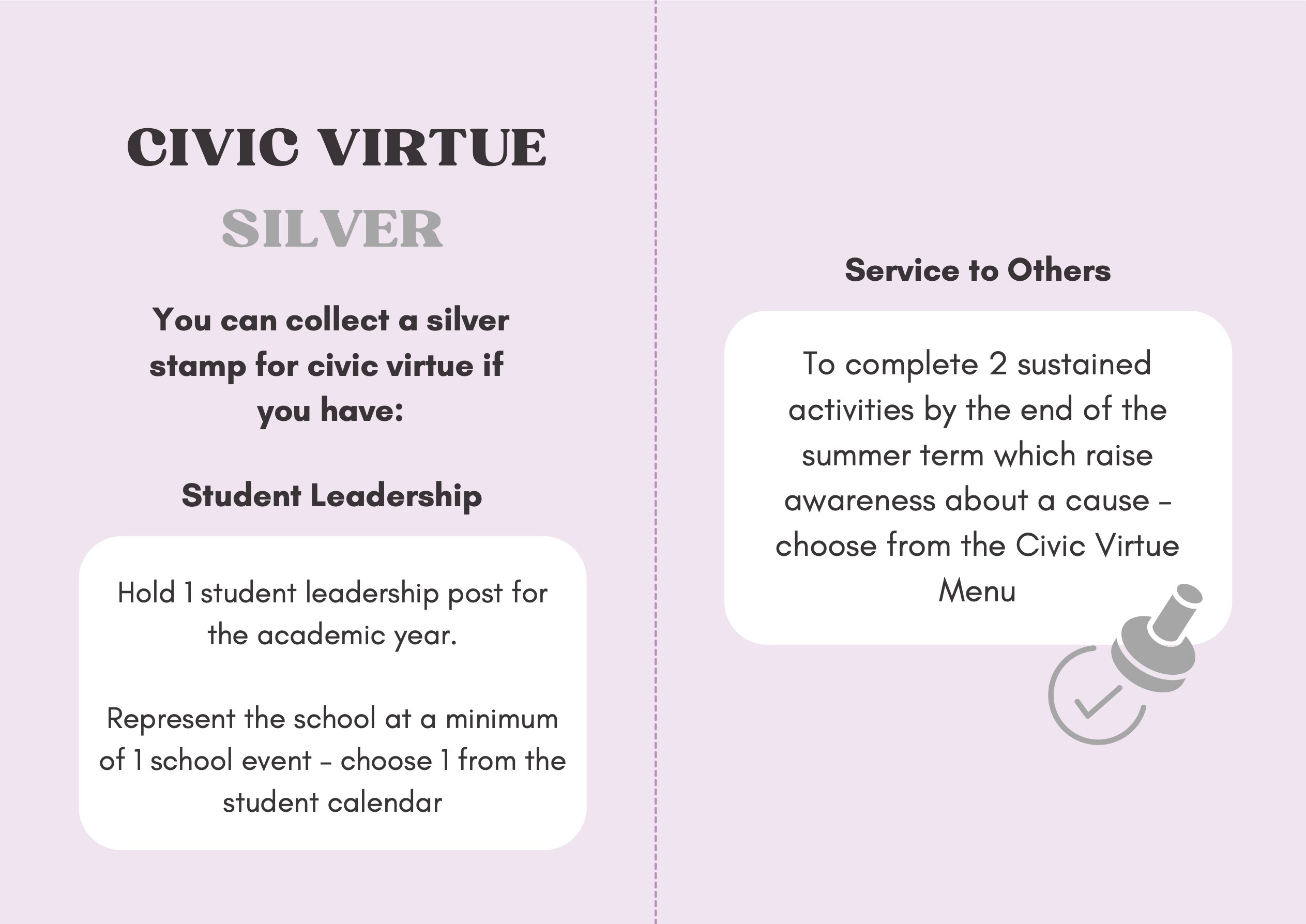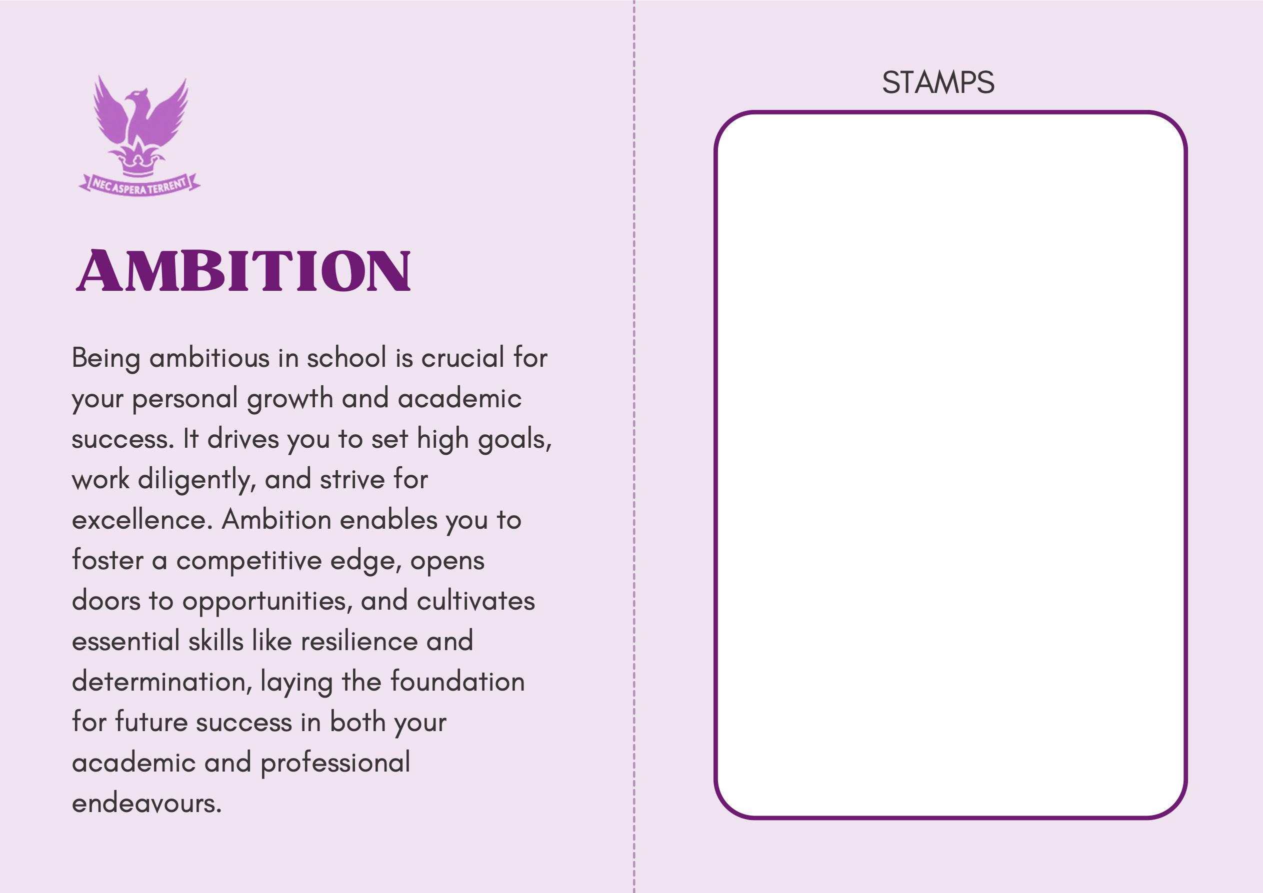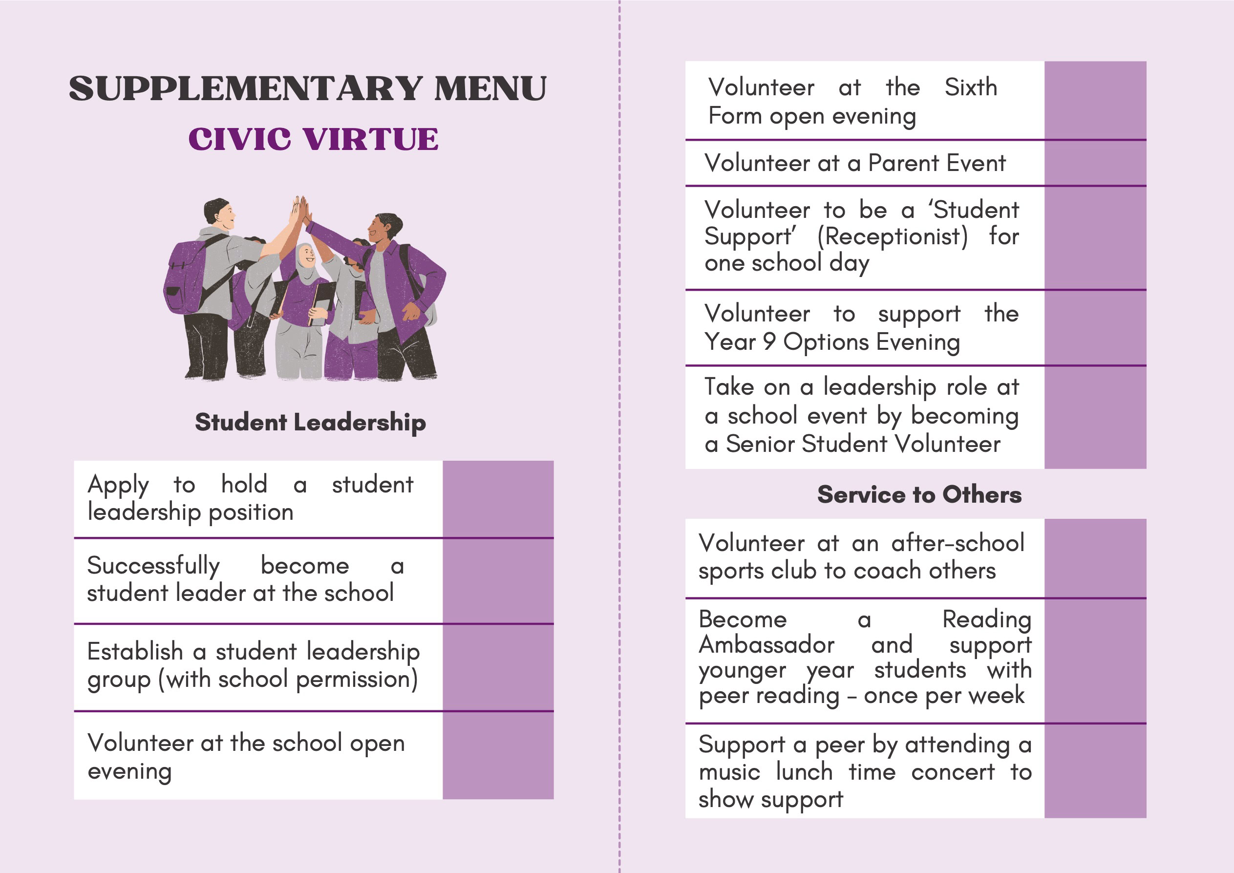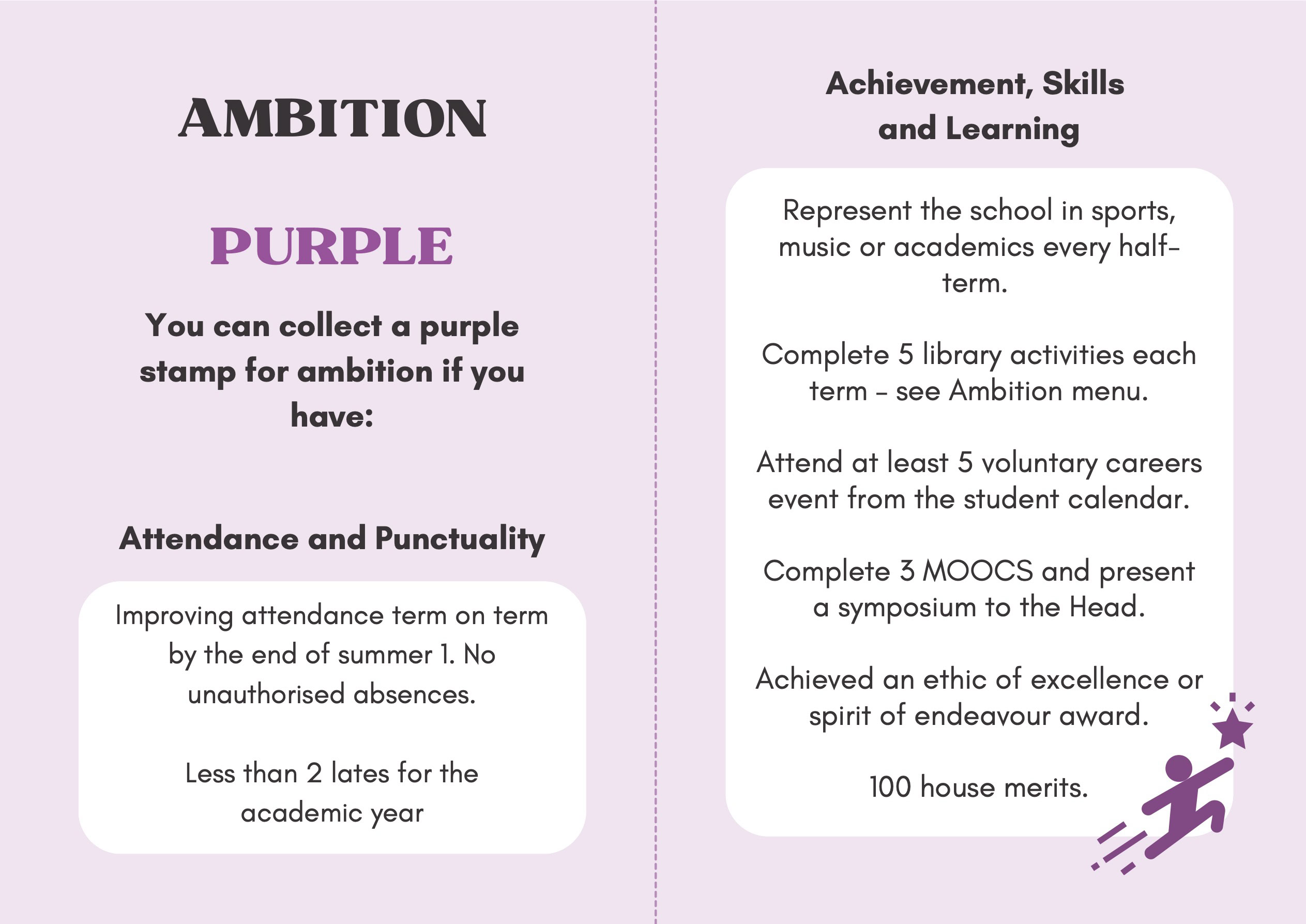 To recognise and celebrate student achievements, the Personal Development Passport is linked to our award system. Students can earn awards at four levels - Bronze, Silver, Gold, and Purple - across three core values: Ambition, Character, and Civic Virtue. Awards are presented at termly celebrations, acknowledging students’ dedication and fostering a culture of active participation.