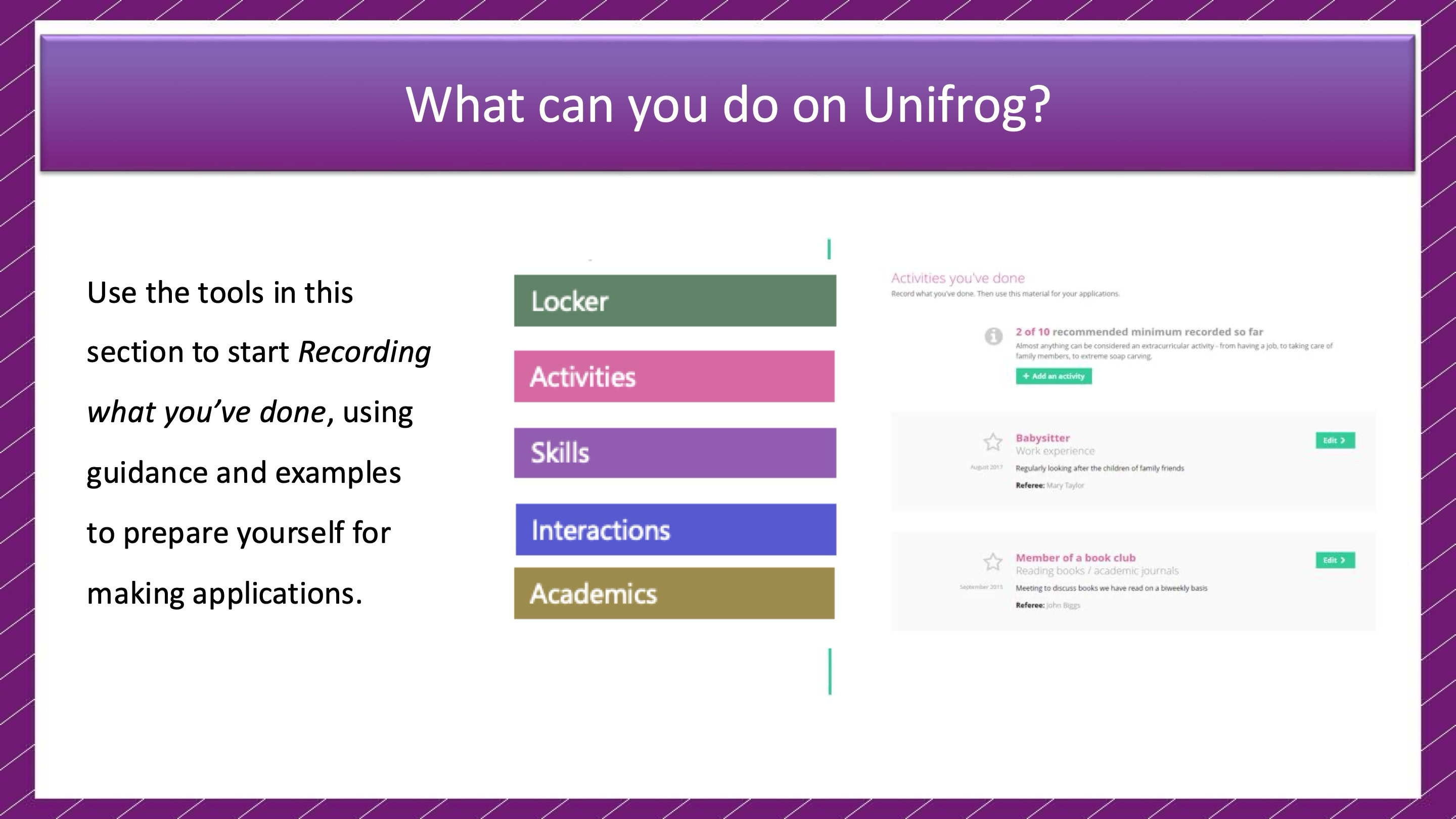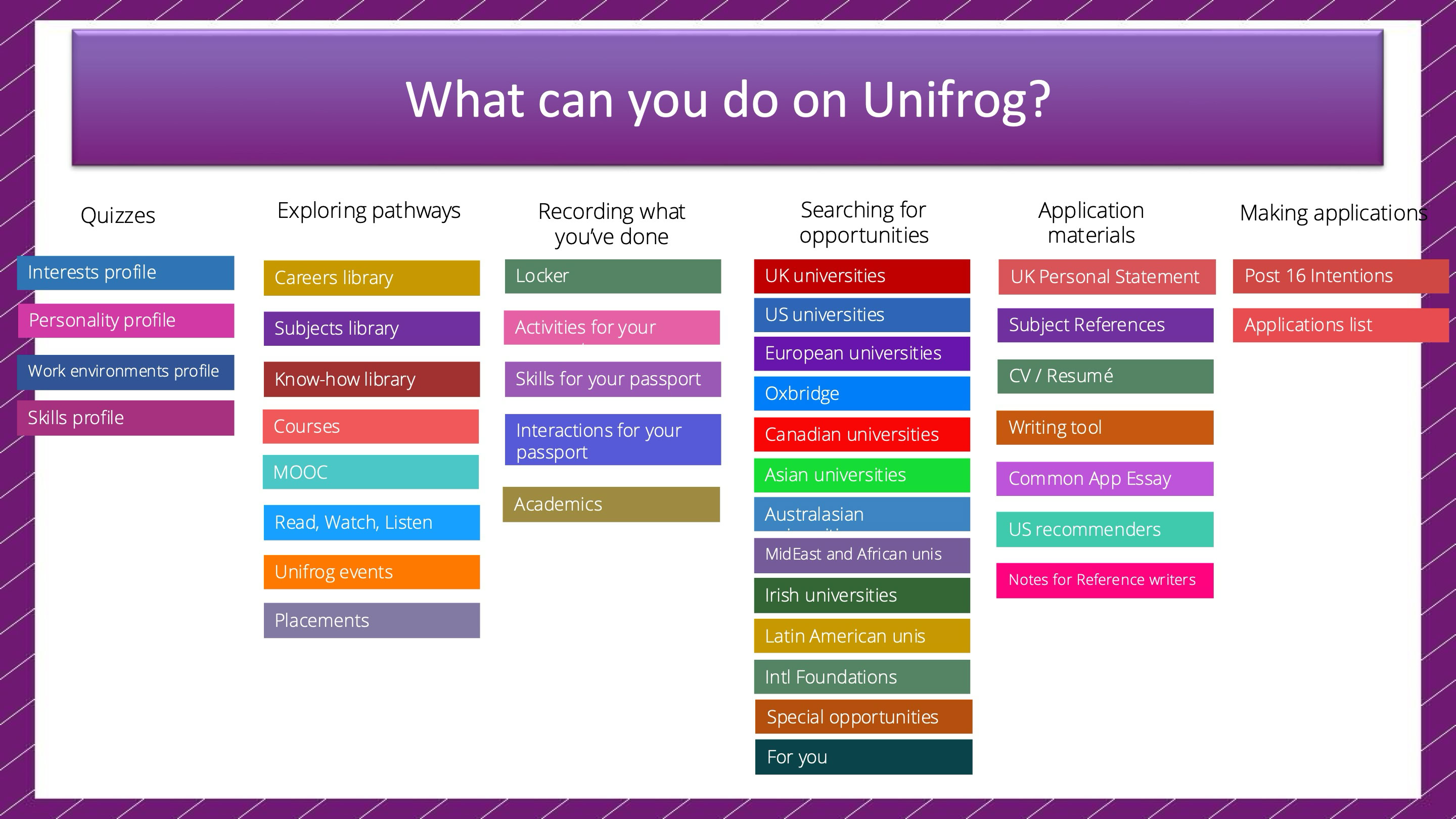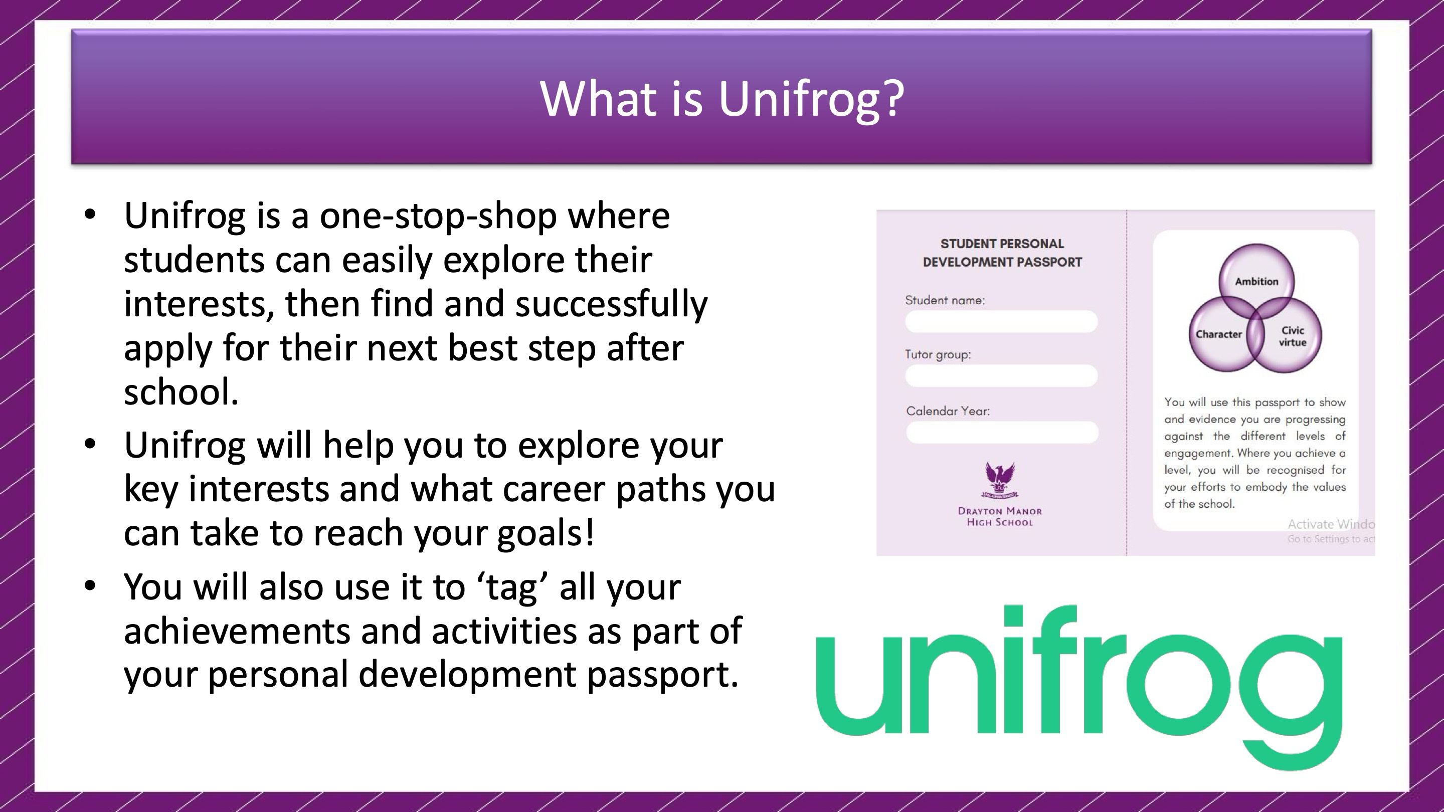 Unifrog is a dynamic online platform that helps students keep track of their achievements, extracurricular activities, and career aspirations. It serves as a digital companion to the Personal Development Passport, providing students with a user-friendly way to document their experiences.