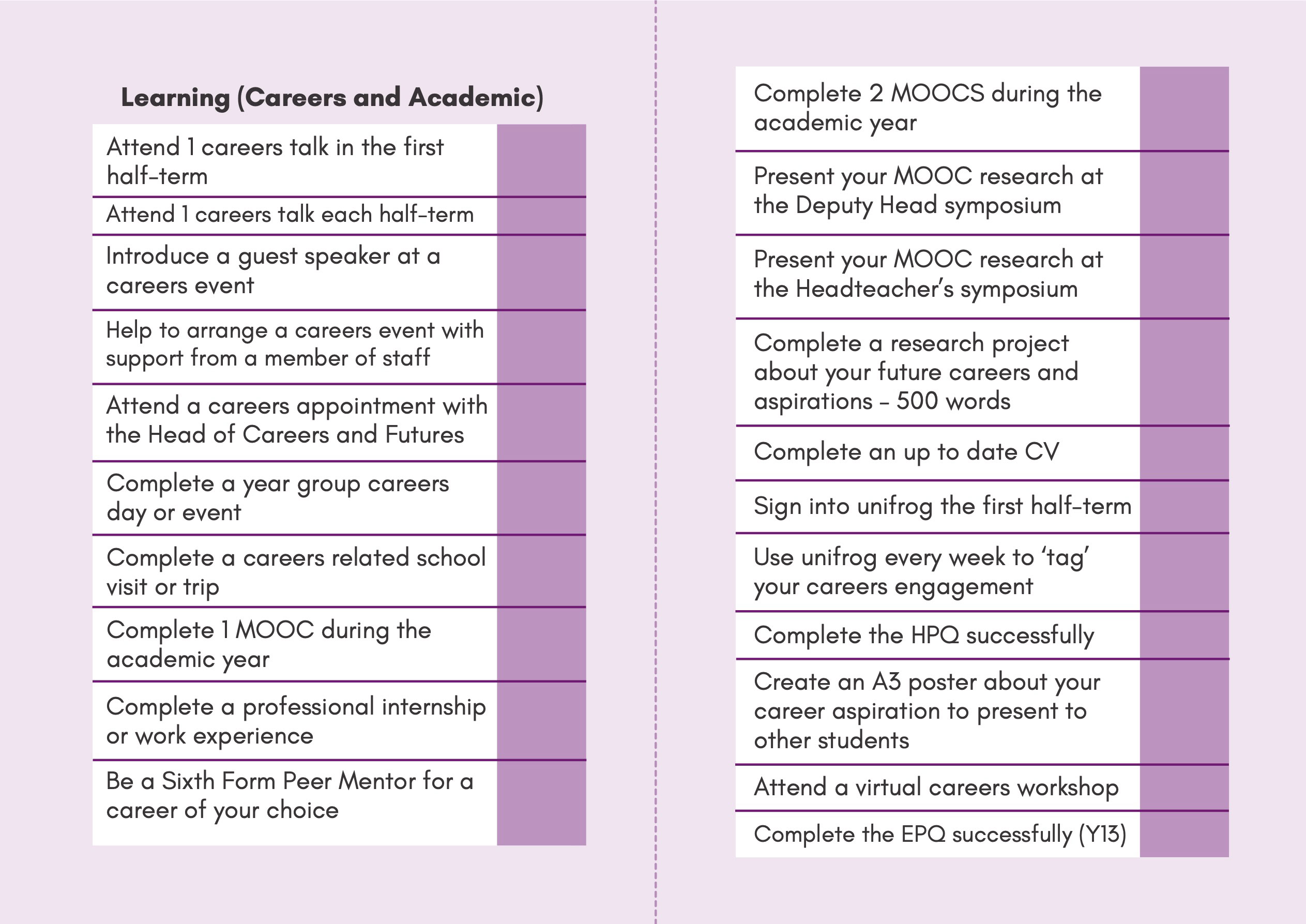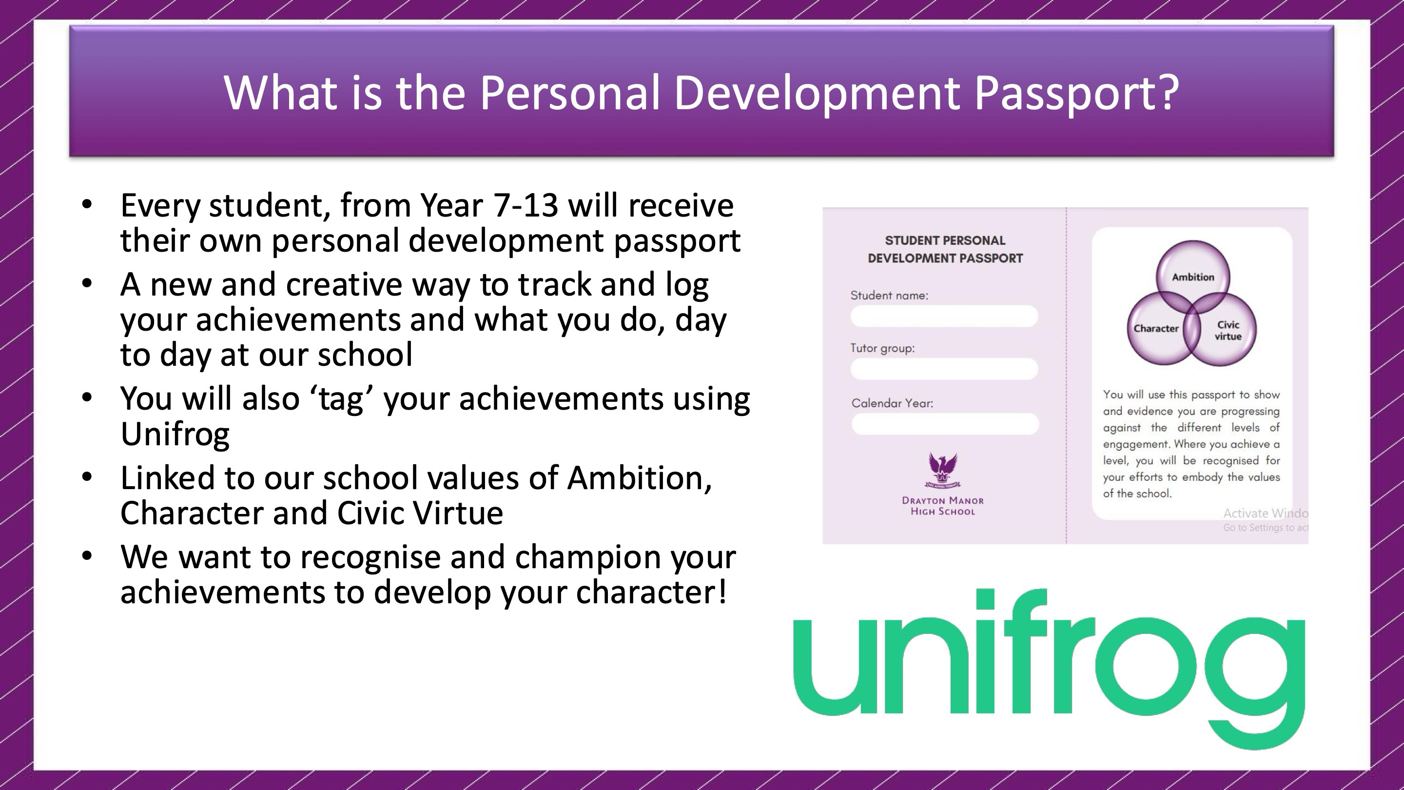 Our Personal Development Passport, launching in September 2024, is a key initiative designed to encourage and recognize student involvement in the wider life of the school. This passport allows students to log their participation in various activities, including sports, music, clubs, guest speaker events, school trips, and career-related opportunities, using the user-friendly Unifrog platform.